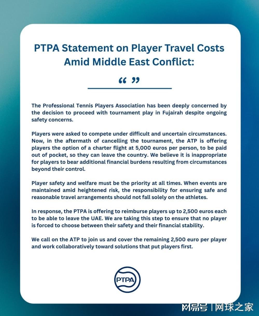 PTPA在对这件事发声时强调,“强烈反对让球员承担超出自身控制的额外经济负担。”对外展示的态度相当明确,认为这笔费用由球员个人承担不合理,同时给出了他们的解决方案,PTPA承担其中的2500欧元,剩余的部分由ATP负责。