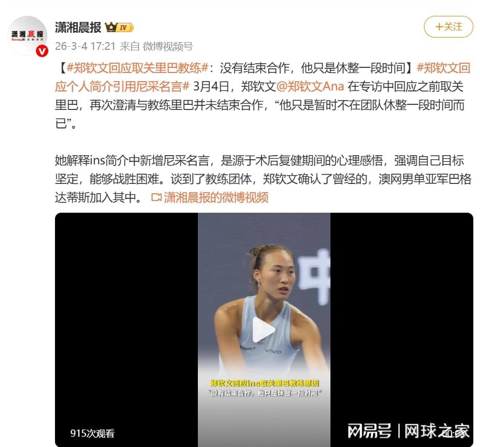 同时郑钦文也强调,和巴格达蒂斯只是临时合作,教练仍是佩雷里巴,“他只是暂时不在团队休整一段时间而已。”